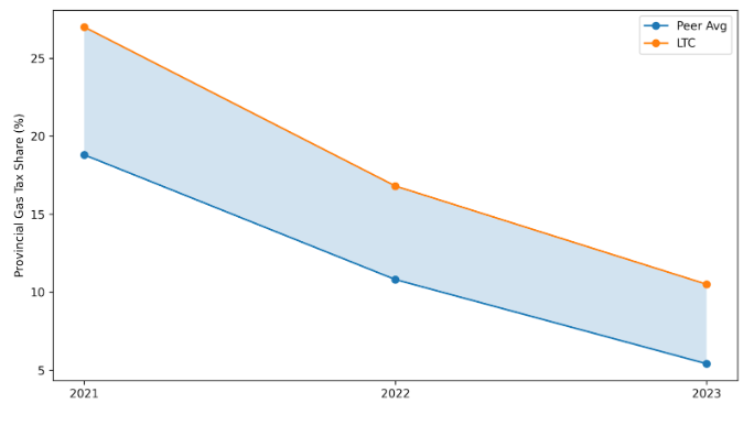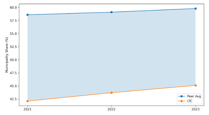 The following charts illustrate how London Transit’s funding structure has diverged from the peer averages over the past three years. The shaded percentage gaps highlight the structural differences that shape service capacity and long-term sustainability.