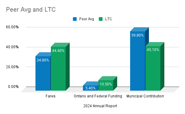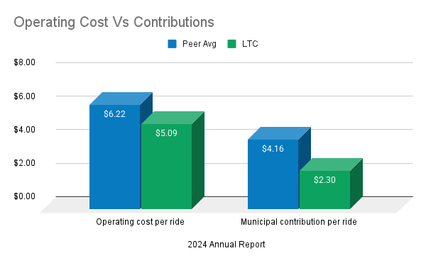 Across all available years, the system outperforms its peers operationally. LTC buses cost less per ride to operate than in comparable cities. It receives less municipal support than comparable cities. It relies more heavily on provincial transfers than comparable cities. That combination is not normal, and this confirms a systemic issue.